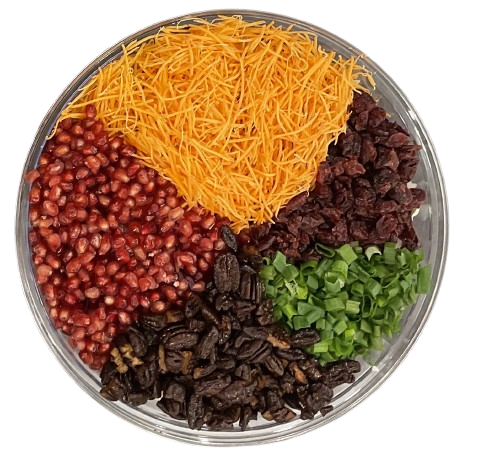 Base: Purple & White Fresh Cabbage Toppings: Pomegranate, Shredded Carrots, Sugared Pecans, Scallions, Craisins Dressing: Sweet & Tangy Vinaigrette